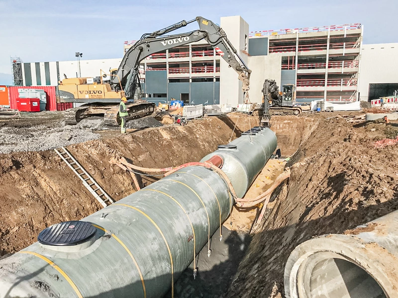 Deze KWS-afscheiders zijn vervaardigd uit glasvezelversterkt polyester, dat sterker is dan polyethyleen. In dit project werden ze geplaatst op een minimale afvoerdiepte van 5 m onder de nieuwe afwerking, wat een troef is. Om een probleemloze installatie te garanderen, werkten de ACO-ingenieurs samen met de aannemer om de vereiste druk voor de mangatdeksels, de juiste hoogte en de aangewezen diameters voor de inlaat- en uitlaatfittingen te bepalen. De kers op de taart was dat de aparte slibvangputten voor de 300 l/s-afscheiders een transportvoordeel met zich meebrachten, aangezien het mogelijk was om afscheiders en slibvangputten afzonderlijk te vervoeren.