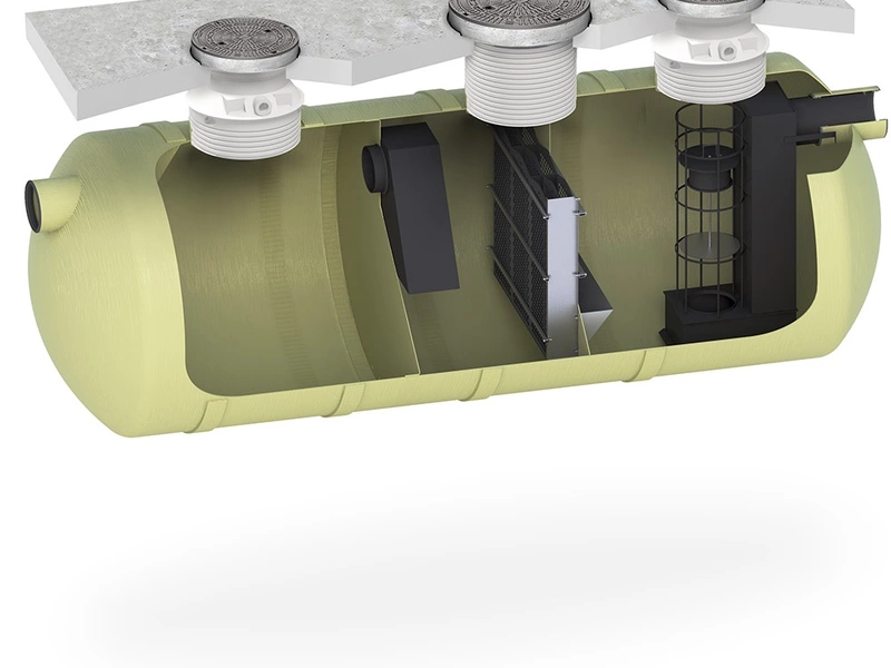 Zo zijn de tanks van de Oleopator-G-H vervaardigd uit glasvezelversterkt kunststof (GVK) en voldoen ze aan de materiaalvereisten van EN 858-1. Bovendien is het systeem makkelijk te inspecteren en te onderhouden dankzij het cilindrische ontwerp van de tank.