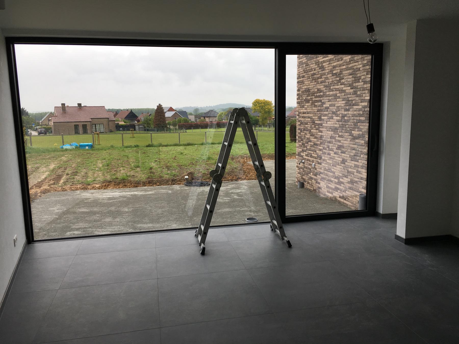 Op een nagenoeg vierkant perceel werd deze alleenstaande woning gebouwd met hoge raampartijen. De eigenaar van de woning gebruikt deze woning tevens als showroom voor buitenschrijnwerk van eigen productie.