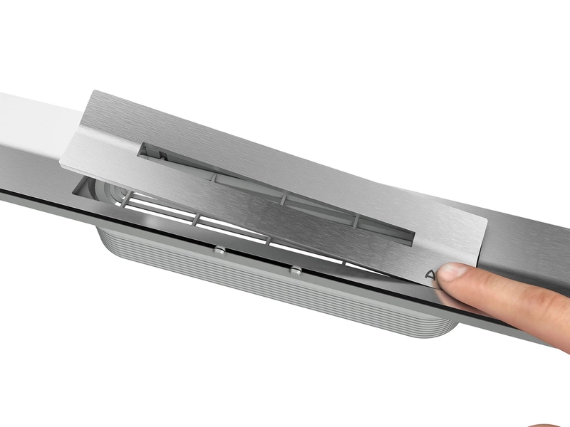 De nieuwe kaderloze douchegoot ShowerDrain S+ is de voortrekker voor de vereenvoudiging binnen het hele gamma. Deze inox douchegoot is eenvoudig te installeren, makkelijk te reinigen en straalt pure sierlijkheid uit. Dankzij de afbreekbare voetjes is de douchegoot makkelijk in hoogte af te stellen. De verstelring zorgt ervoor dat het opzetstuk met elke soort tegel te gebruiken is. Met één vingerduw kan het rooster makkelijk verwijderd worden (Tip & Flip) om het haarzeefje eruit te nemen en om meteen toegang te krijgen tot de afvoerbuis. De discrete helling biedt een optimale afwatering zonder opgedroogde watervlekken.